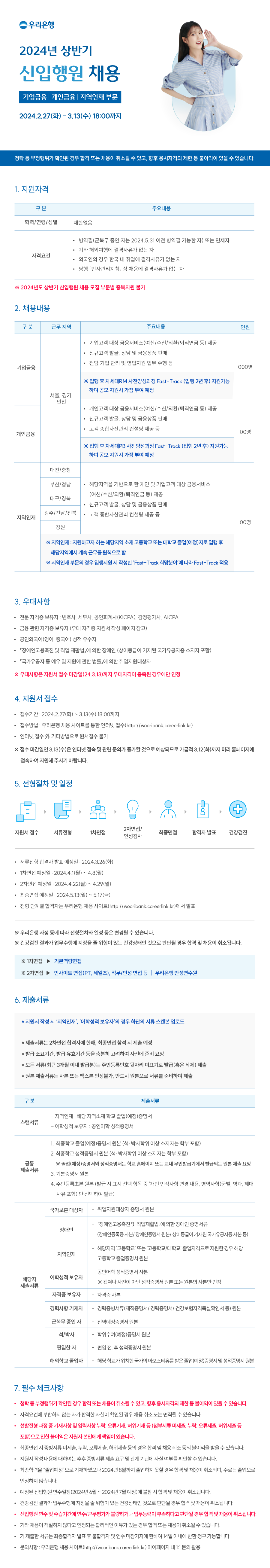 | 2024년 우리은행 상반기 신입행원 채용 (3/13 18시까지) | |||||
