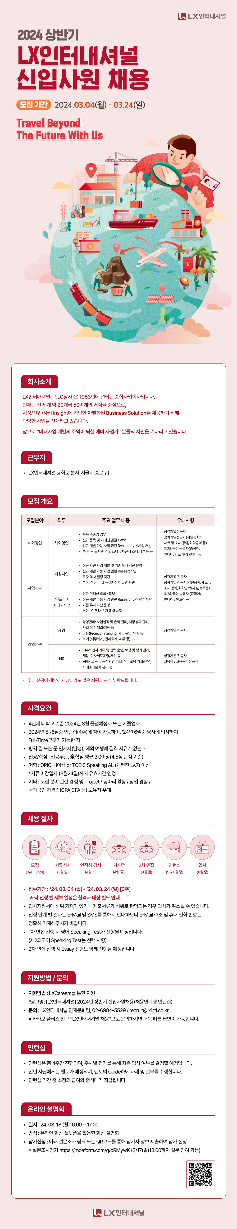 | [LX인터내셔널] 2024년 상반기 신입사원 채용(채용연계형 인턴십) | |||||